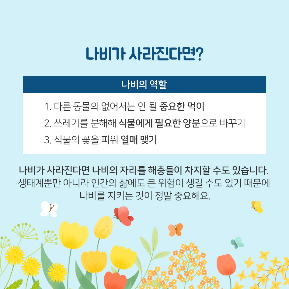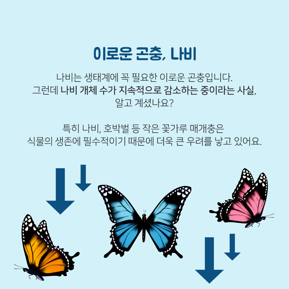 기후변화가 나비에게 끼친 나비효과?! 페이지 정보 작성자 관리자 댓글 댓글 0건 조회Hit 788회 작성일Date 23-04-05 11:34 본문 본 저작물은 "공공누리" 제4유형:출처표시+상업적 이용금지+변경금지 조건에 따라 이용 할 수 있습니다.출처: 국가환경교육센터 목록 이전글탄소중립을 위한 목재산업 23.04.05 다음글섬유를 필환경 소재로! 23.04.05